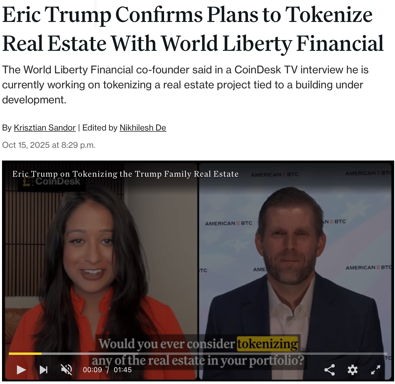 Eric Trump confirmed this past week via CoinDesk that his venture, World Liberty Financial (WLFI), is building a tokenized real-estate deal around a property in development.
