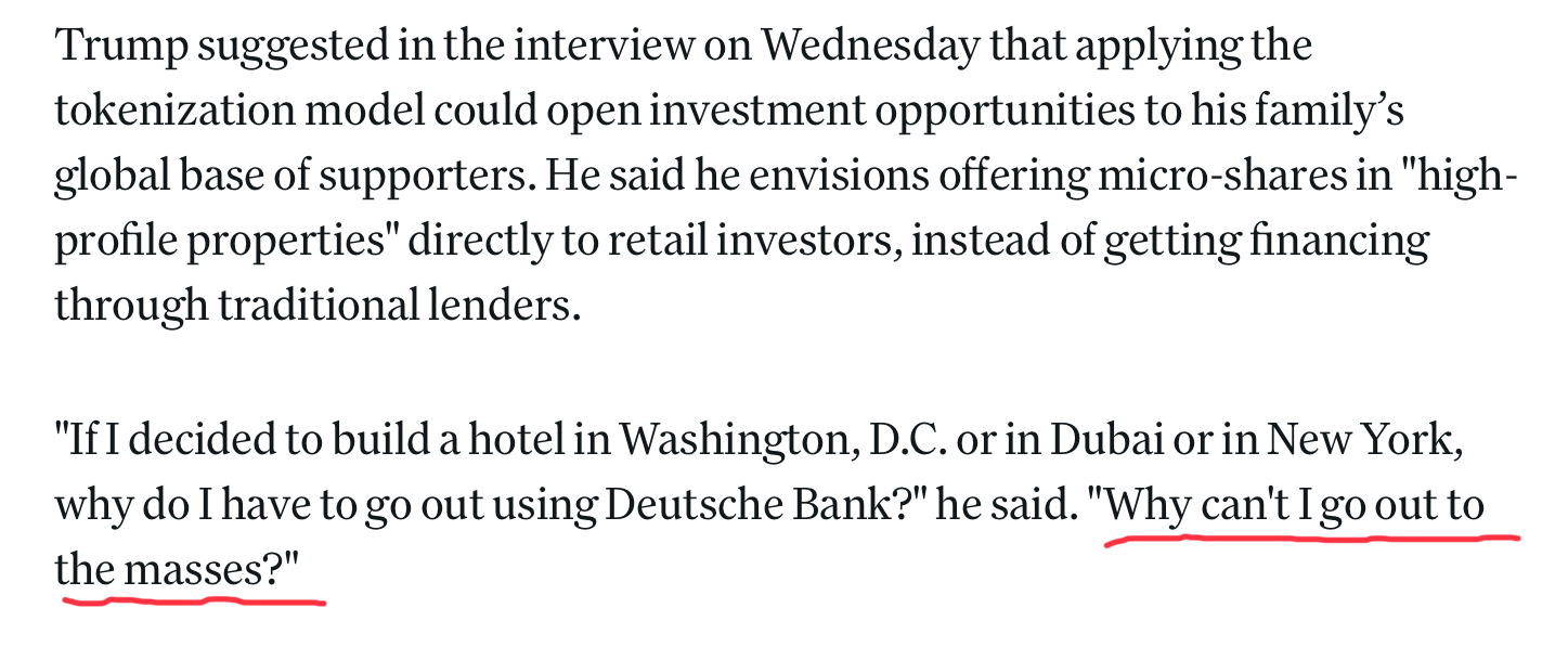 The pitch: bypass Wall Street, let everyday investors buy micro-shares, and fund the project directly through blockchain rails and WLFI’s own stablecoin, USD1.